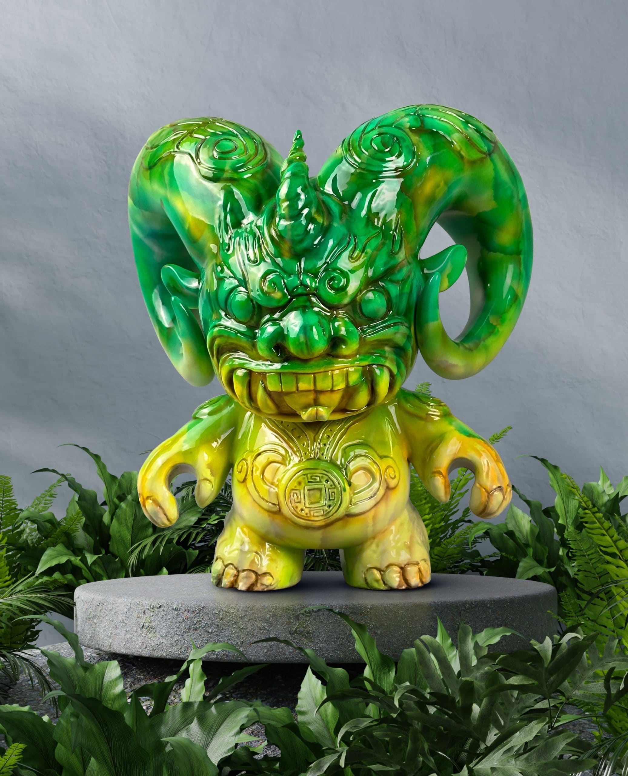 貔貅是轉禍為祥的吉瑞之獸。祂能吞萬物而不泄,只進不出、神通特異,故有招財進寶、吸納四方之財的寓意,同時也有趕走邪氣、帶來好運的作用。藝術家運用特殊技法呈現如玉之質感,更提升整體貴氣。